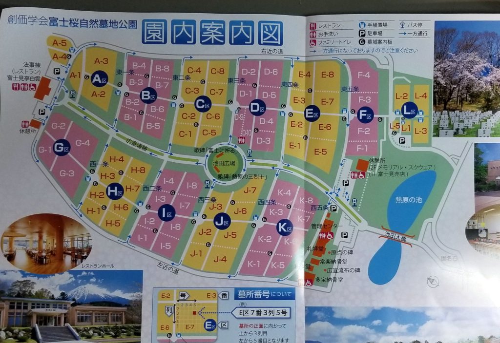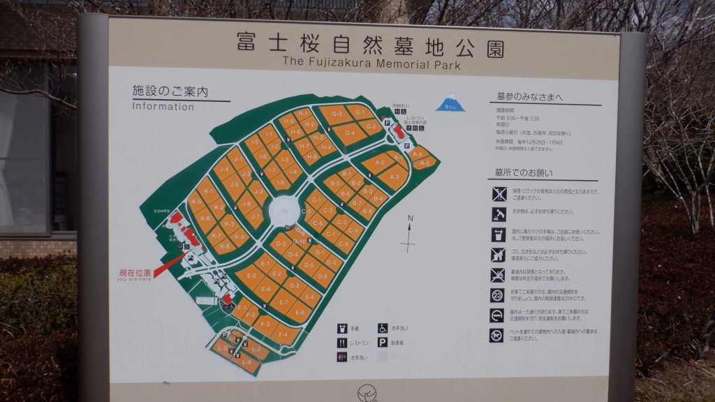 新富士からタクシーで行く。8900円かかった。大石寺を過ぎて白糸の滝を過ぎて、やっとこさ到着。まず思ったのは、大石寺とちがって人が多いこと。家族連れが多い。これは公明党の選挙会場でも同じで、学会の信者は2人以上で行動する人が多い。駐車場の前に葬儀関係の施設が3つ並んでいる。公園内の地図を見る(写真参照)。墓地公園内の大半が墓地。どうやらここは公園ではなく墓地のようだ。