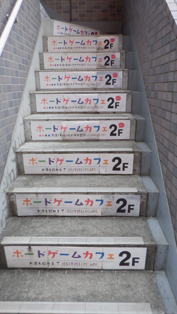 「ボードゲームカフェ2F」と書かれた怪しげな階段を登っていくと下駄箱があり、ボードゲームカフェではなく猫カフェの「にゃんくる」がある。しかし「にゃんくる」って、ワーメイの占い喫茶「アタール」みたいなネーミングだ。