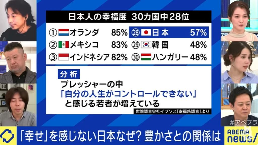 日本人の幸福度が低いというので、何故なのかを議論する企画。その企画に匿名匿顔で登場する女性が、「なるほど、こうやれば不幸になれる」って感じで、どうやって探したんだろうと感心してしまうほどなのだ。