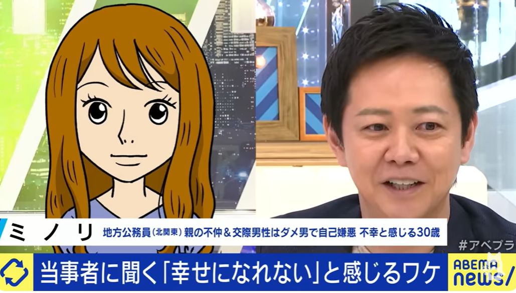 地方公務員のミノリさん(4分15秒あたり)曰く、「今パートナーはいないんだけど、つきあってきた男の殆どがダメ男、借金・ギャンブル・浮気・暴力・前科」「私が悪いからこの人はこうなんだろうなーとどんどん”自分sage”になる」…早速、西村博之に「どうして不幸かの話に、彼氏とか他人の話を持ち出す時点で、(幸福になるのは)無理」「自分自身が生活してて、「何が嫌」か」を言わない。」「他人がこうだからと言っても、人間、他人を変えられるわけない」と突っ込まれる。