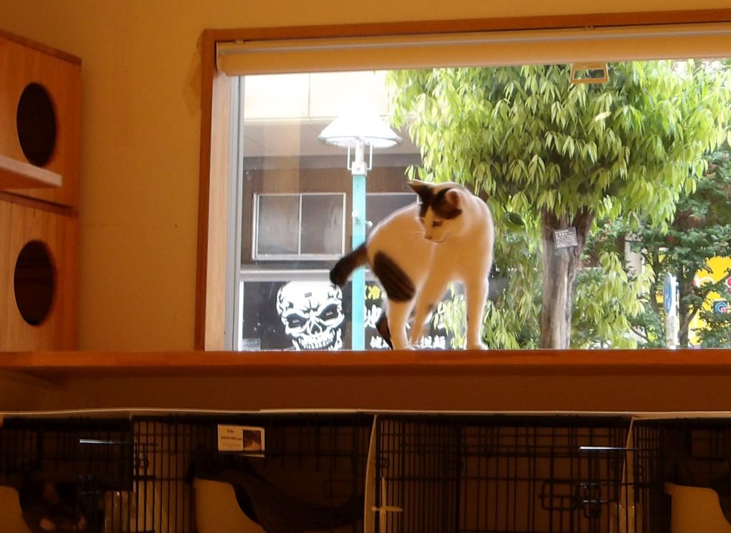 猫さんは野良度が高く、聞いてみるとやっぱりどこかから流れてきた猫さんのようだ。もう一つ、ここでユニークなのは「猫窓」。簡単に言えば、道路に面した窓の縁を猫が座れるように広くしただけ。しかし猫がそこに座ったり歩いたりするので、道行く人が思わず覗き込んでしまう。ありそうでなかった「戦法」だ。考えてみれば、うらぶれた将棋道場同様に、猫カフェは雑居ビルの上の方にあることが多い。