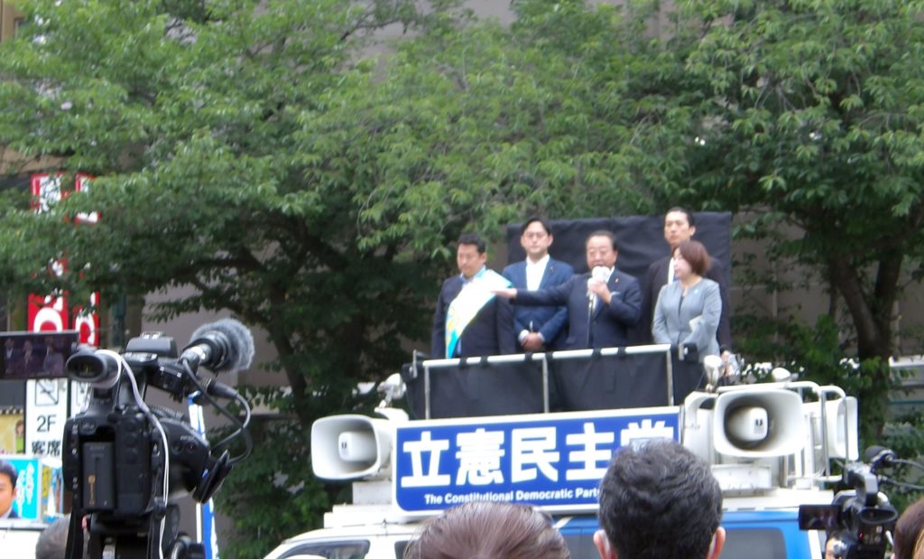 午前10時30分到着。立憲民主党が演説している。かなりの人だかり。野田佳彦代表が来ている。どうやらここが「党首第一声」らしい。