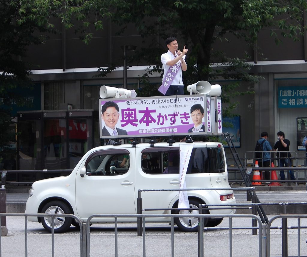 今回もっとも見たかったのは、オタク議員連盟のリーダー、大田区議のVtuberのおぎの稔。都民ファーストから都議にに立候補し、武蔵新田で第一声を行う。そしておぎの稔陣営運動員には、何故か大川宏洋が参加している。
