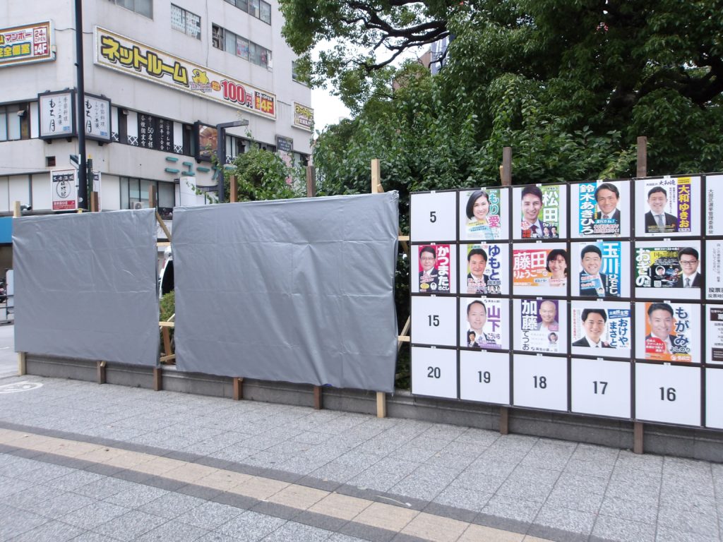 駅前にはデカデカと選挙掲示板。3連の巨大掲示板だが、うち2つにはカバーがかけられている。案の定だ。