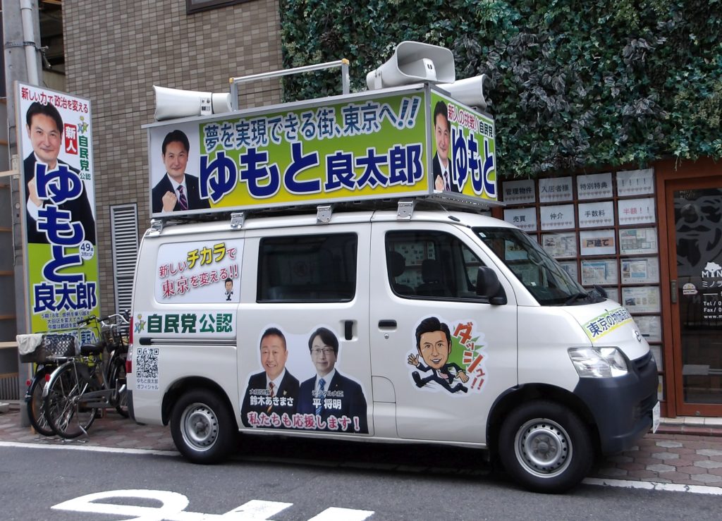 自民党の選挙カーを発見。自民党のゆもと良太郎候補の事務所前だった。平日の金曜日だけど、候補者は元気。中野も蒲田も平日でも若者などで人だかりなので、候補者にとっては先んじるチャンスなのだ。