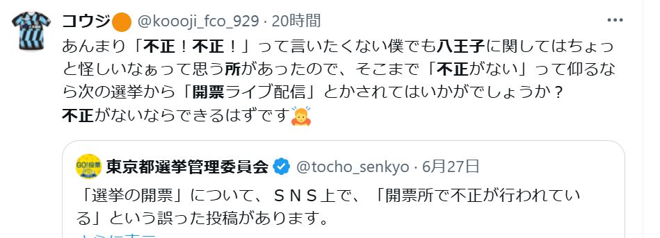 参政党を筆頭に各種反ワク勢力やDS存在説を唱える勢力は、日本の議会に深く広く浸透している。今日も元気いっぱい参政党支持者は「都議会八王子市選挙区で不正があった、当選していた」と抗議し、選管を怯えさせてしまった。