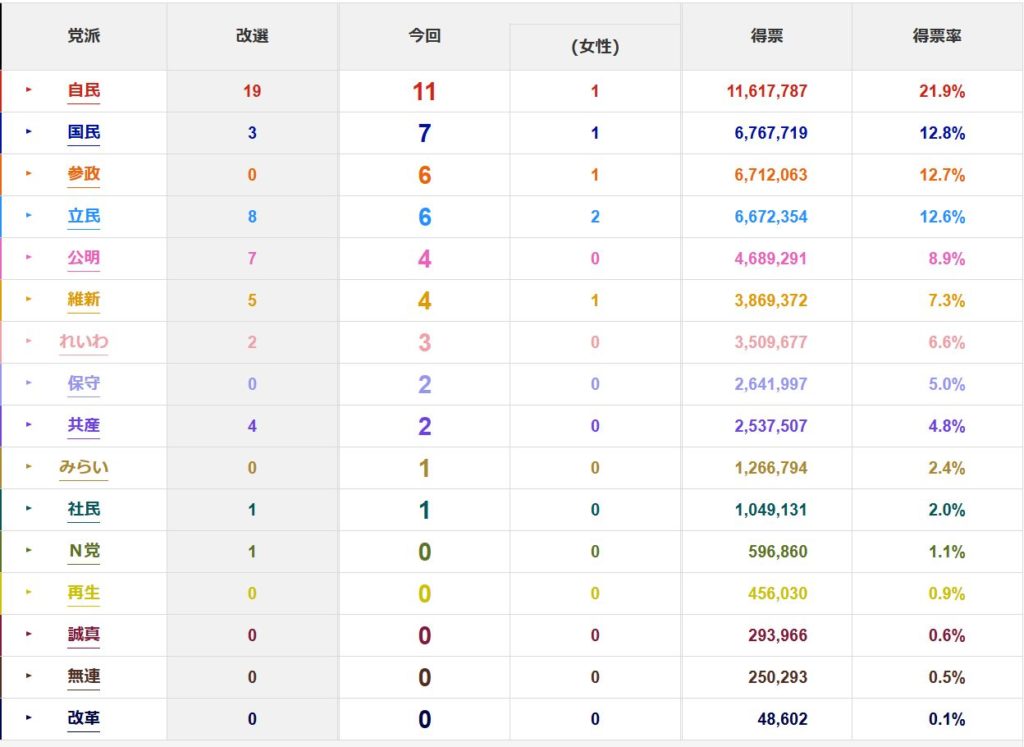 一方で参政党が大きく伸長しているので、反ワク・DS的な電波主張よりも、「日本人ファースト」排外主義の方が受けたということでしょうか。