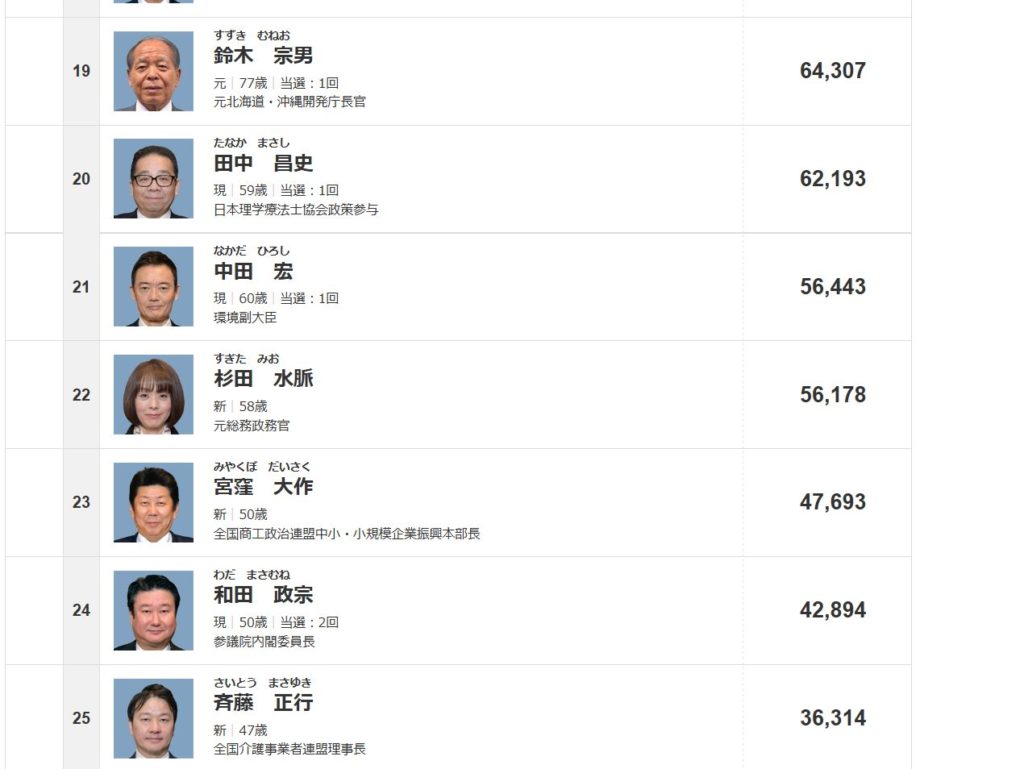 もっとも、杉田水脈の下に中田宏がおり、更に下を見ると和田政宗40.805票なんてのもあり、保守ネトウヨのトレンドの変化も感じられます(図は6時25分現在なので票や順位が違います)。