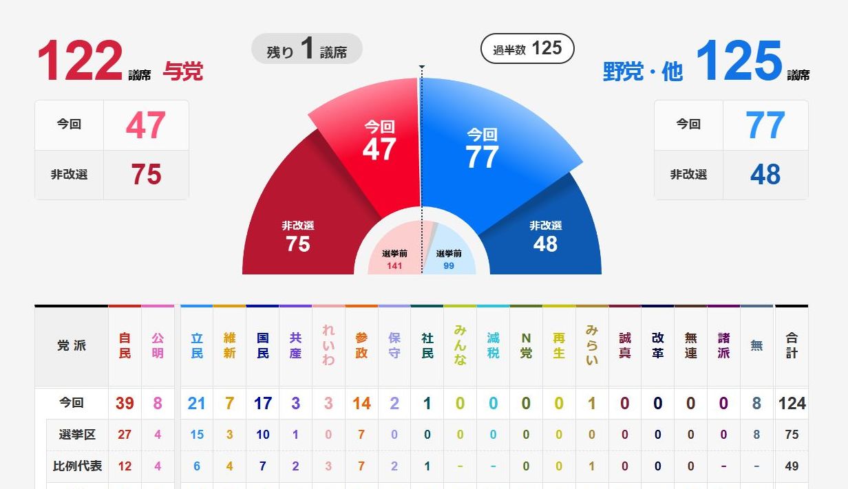 ネトウヨvsパヨクでみれば(6時15分現在)、ネトウヨ88(自公+維新民民参政ハゲテク)に対してvsパヨク(立憲れい共産社民)はたった28(無所属はどっちだか分からないので省略)。国民はナチナチオウムでカルトでヘイトで差別を選択したのです。憲法9条擁護にNOを示し、民族排外主義・日本人ファーストを選択したのです。
