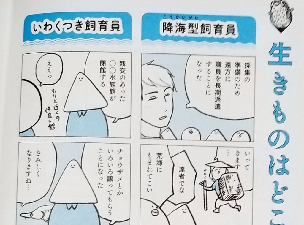 水族館飼育員のただならぬ裏側案内(なんかの菌著・集英社インターナショナル)。水族館の飼育員が、水族館の裏側を書いた作品で、漫画半分・文章半分で構成されています。