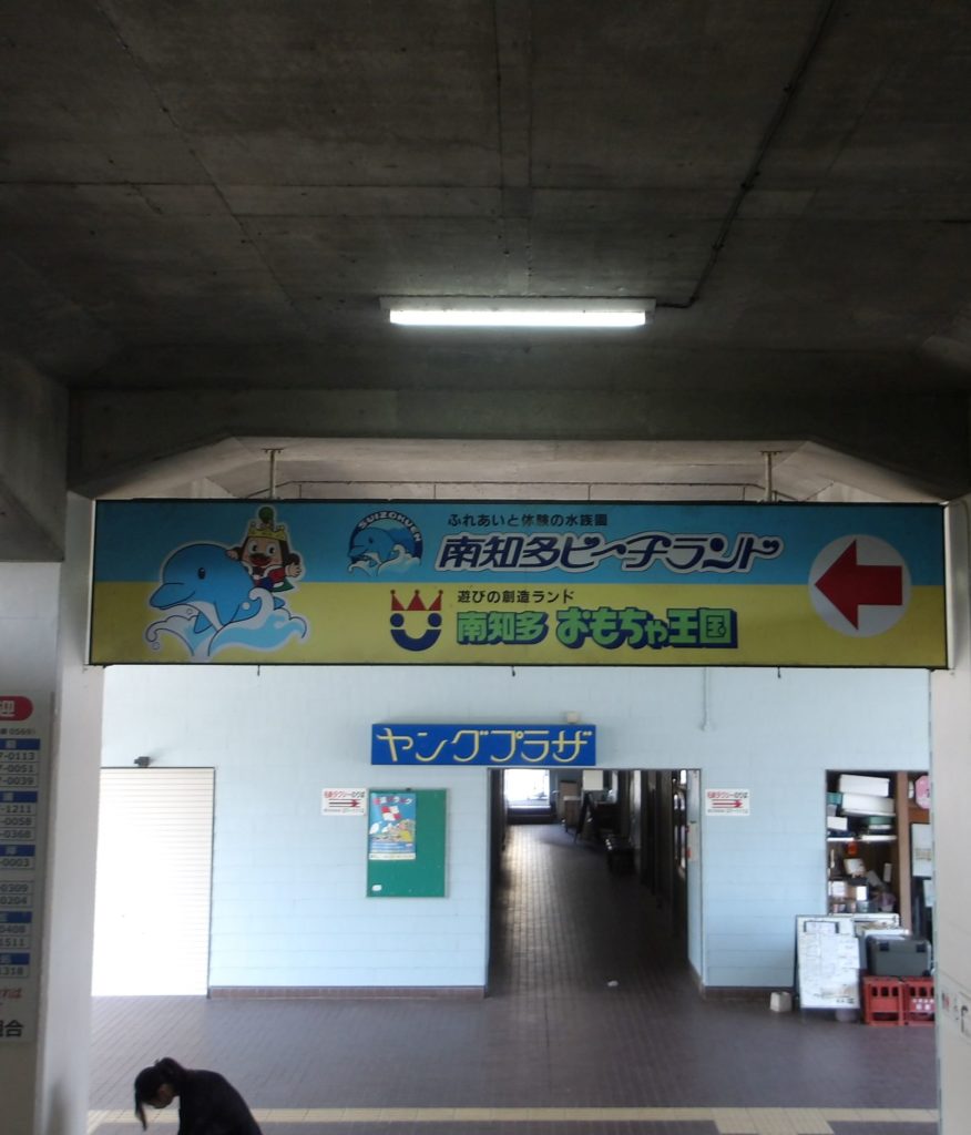 ガラガラの駐車場の向こうに「南知多ビーチランド・南知多おもちゃ王国」のアーチを発見。この駐車場が祝祭日にはどれくらい埋まるのか。基本的に電車に乗って来る人は少なそうだ。