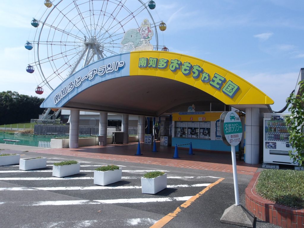 しばらく歩くと車が走ってる道路があり、また「南知多ビーチランド・南知多おもちゃ王国→」の看板。そして彼方に観覧車。どうやらたどり着いたようだ。なお、知多奥谷駅からのバスもタクシーもない。というのか一台も見かけなかった。おそらくGO圏外だろう。