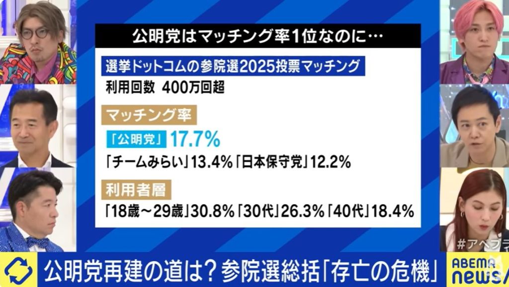 政党マッチングアプリ。あれは党名を伏せて、どの政党の政策が良いかを聞く。すると、一位は公明党の政策になる。政党マッチングアプリ利用者は無党派層で若者が多い。だから政策そのものは悪くない。
