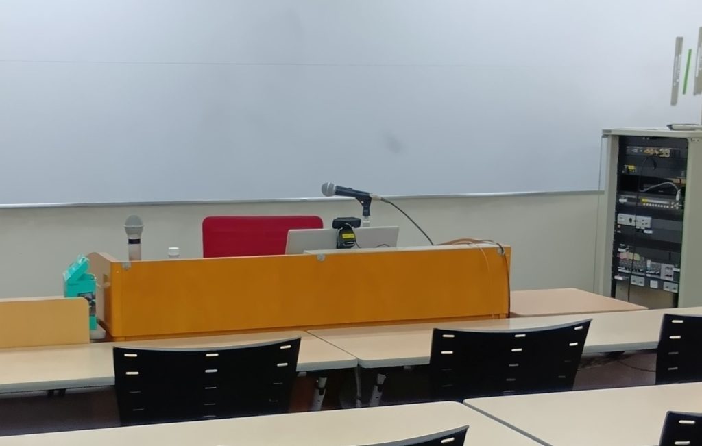 会場の18番教室に入る。私が一番乗り。大学の小教室くらい。講師卓にZOOM中継用のカメラなどが設置されている。
