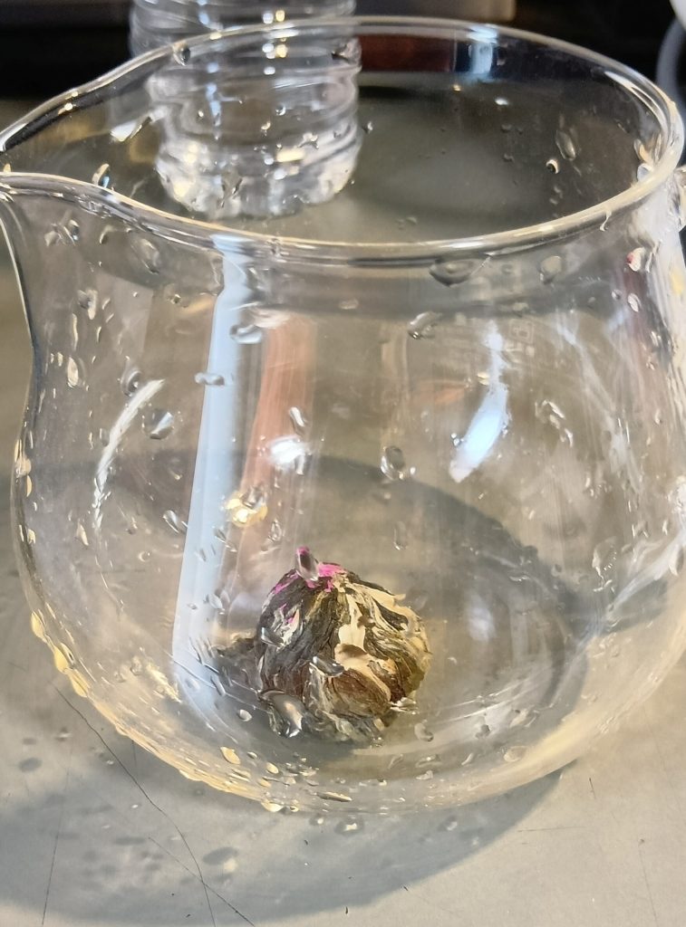 右:透明急須に投入。お湯を注いで10分待てば開花するらしい。