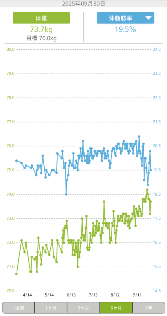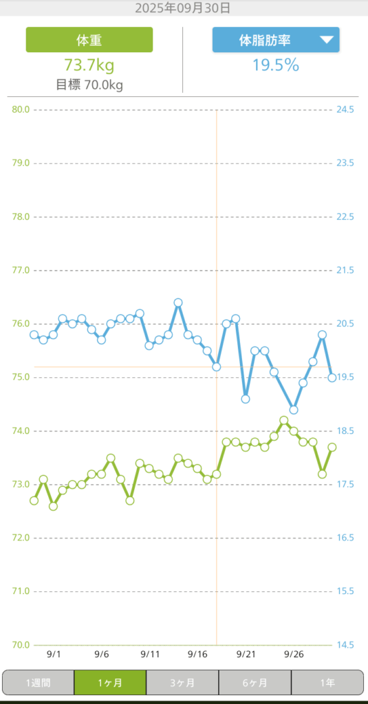 74kgを超えたのは何年ぶりだろうか。調べてみたら何と一昨年の12月20日以来。76kg75kgと下がって、74kg台とさよならして以来だった。(体重は下のグラフで目盛りは右側。上は体脂肪率。)