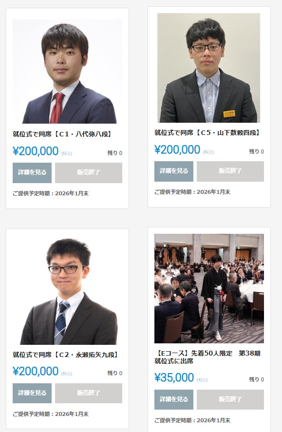「【Cコース】 各組優勝者と就位式参加 20万円 限定6組12人」って、これは周囲式にプロ棋士と一緒に参加できる権利。『同じテーブルで竜王戦就位式に参加していただき、コース料理と会話を楽しんでいただく権利』が20万円。AKB48なら分かるけれど、これは一種の地下アイドル感覚で女性が購入するのでしょうか。