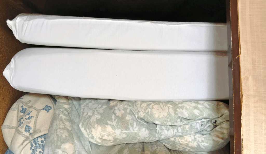 だけどこれ、押し入れに入らないんだよ。縦に布団を差し込むように入れて、中で斜めにして横にしていって突っ込む。出来上がりはこんな感じ。