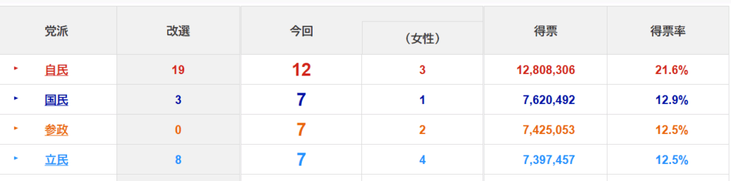立憲が比例得票率第四位に転落しただけではない。日本共産党は壊滅的打撃。有権者は左翼政党に力強いNOをつきつけたのだ。一方自公が減ったと言っても、代わりに選んだのは参政党や民民党。維新も予想を覆し微増している。百田新党も伸びている(崩壊中だけど)。
