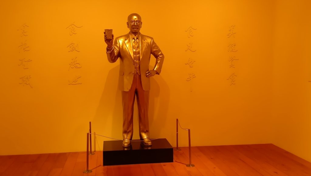 「カップヌードルが大量に飾ってあるしょーもない博物館なのかな」と思いきや、そうではない。世界で初めてインスタントラーメン(チキンラーメン)を作った安藤あんどう百福ももふくの偉業を称える博物館で、売店にはカップヌードル関連のお土産の他に。彼の著作が売られている。
