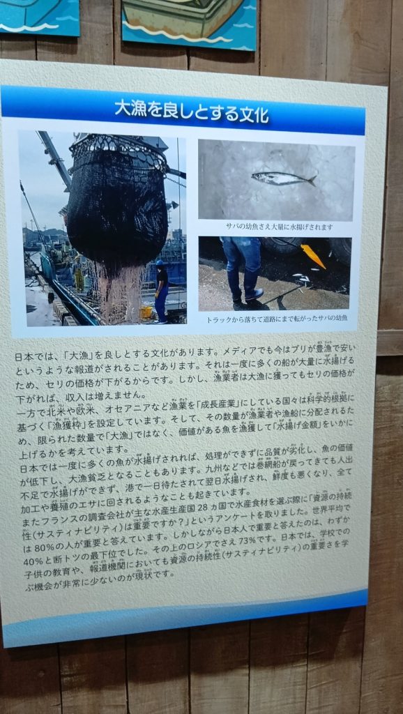 この原因を招いたのはあくまでも日本の大漁文化であり、水温の温暖化でもないしクジラが食っちゃうからでもないし、外国人が密猟するから減ったわけでもない(ま、密漁してるんだけど)などのパネルが貼られ、お客さんもそこそこ真面目にパネルを読んでいた。