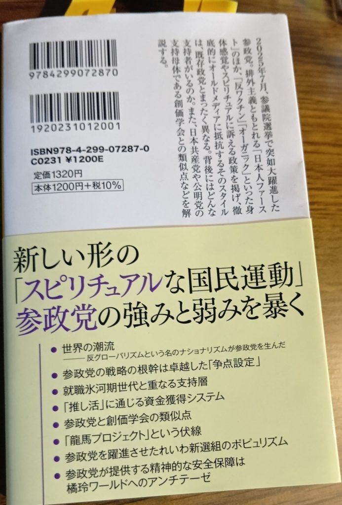 第2章で、21世紀の日本は伝統仏教と新宗教が衰退したので『広大な精神的空白地帯が広が』った(P69)。そして『自然が真空を嫌うように』新たに精神的な空白地帯に入り込んだのが、『組織や教義にしばられない、個人的で実践的なスピリチュアリズム』…一見バラバラに見える『オーガニックブーム、代替医療、自己啓発セミナー』である(P.69)。しかしそれは参政党の一面であっても原因には思えない。