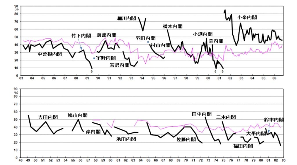 いくら「マスコミは左」と言っても、右寄りの高市早苗になったら自民党は人気回復した。これをニューメディアの影響と考える人もいるだろう。ただ、ニューメディアなんてなかった昔から、佐藤栄作や中曽根康弘は、マスコミや左翼政党がナチナチ叫んでも長期政権を築いた。日本人の多くはネトウヨ政権が好きなのだ。(グラフはhttps://honkawa2.sakura.ne.jp/5236a.html より。昔の方が内閣支持率が低めだったんだね)