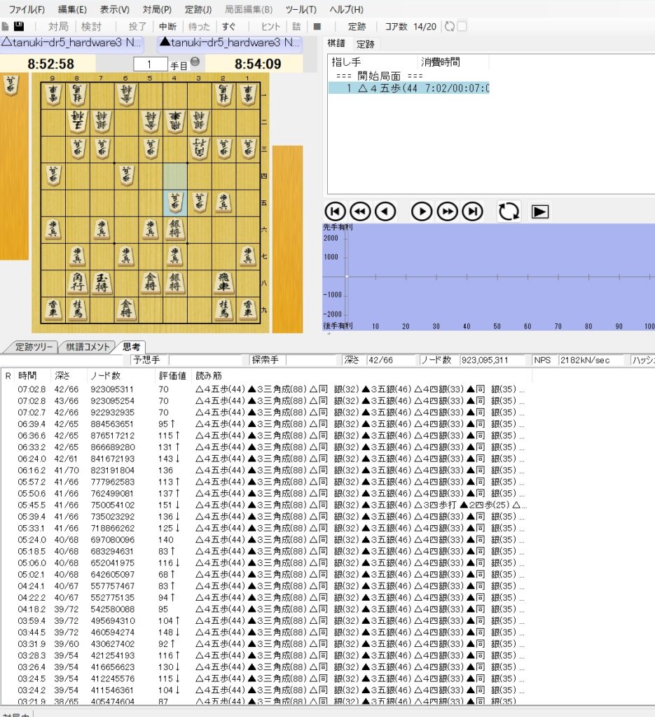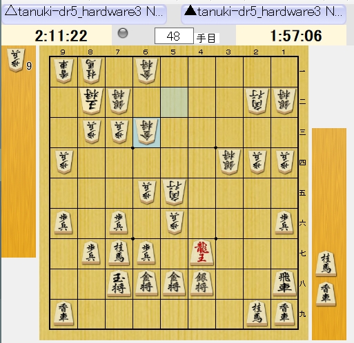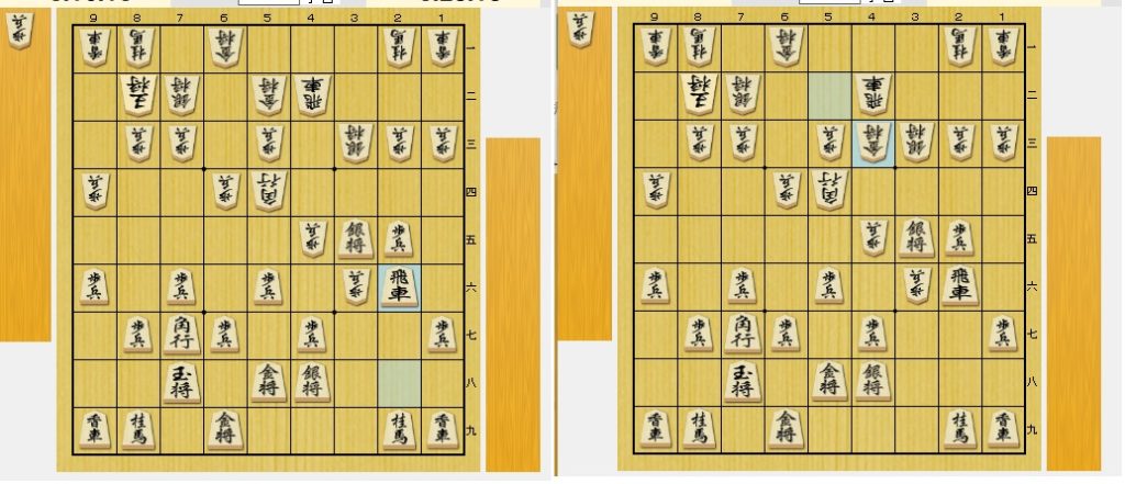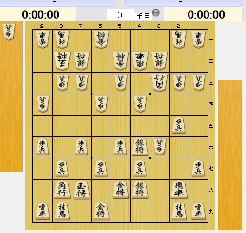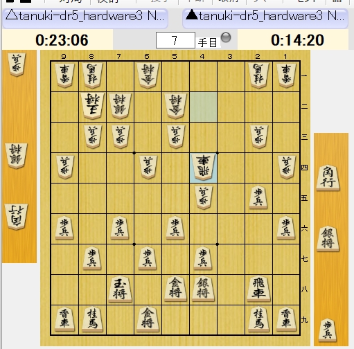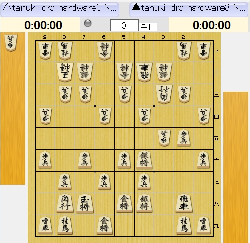 持ち時間は9時間。名人戦と同じにした。初期画面は図2を採用。WIKIの山田定跡のページは1筋の端歩は付き合ってないのでこれを採用する。しかし、前述のようにAIは図2で▲3五歩と仕掛けないので、▲3五歩△同歩▲4六銀(図3)からスタートする。なお、勝敗を決める目的ではないので、中盤でストップしている。