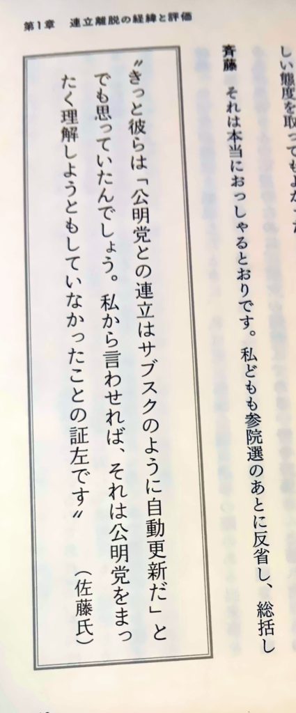 「公明党の決断:連立離脱と新たな挑戦by斉藤鉄夫・佐藤優@第三文明社」という本を読んだ。出版社・メンバーそして何よりも内容的に、一般向けと言うよりは創価学会員を対象にしているように感じた。