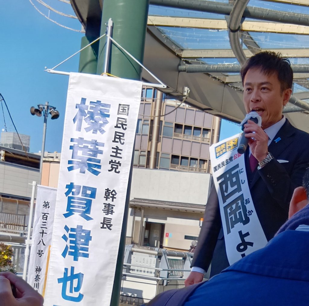 武蔵溝ノ口駅を降りると民民幟が大量に建てられ、ビラ配りの真っ最中。榛葉幹事長来たると伝している。