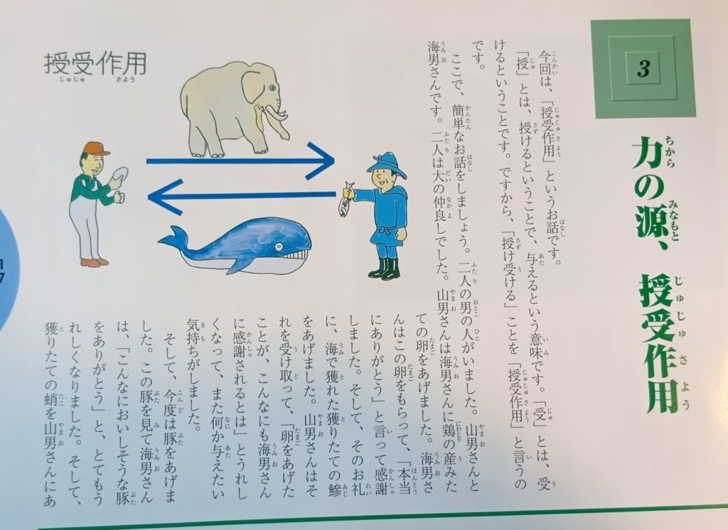 AさんがBさんに鶏卵をプレゼントした。Bさんは「いただいて申し訳ない」と思い、Aさんに鯖をお返しした。「まあ、こんなに高価なものをいただいて」と思ったAさんは豚(多分切り身)を送った。それに驚いたBさんがタコを… そうやって「もっとあげたい、もっとあげたい」という気持ちになっていくのだそうだ(「小学生のための原理講義」より)。