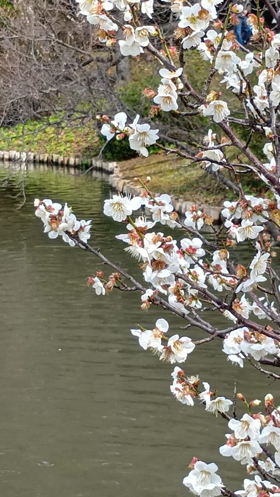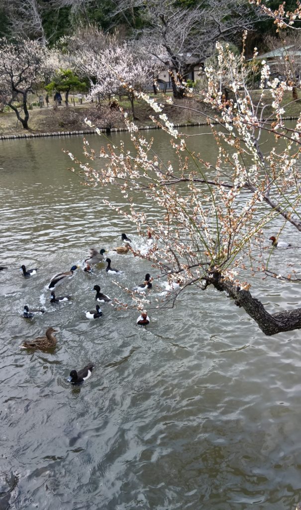 入場料は900円も取られます。それだけに中身もしっかりしています。ただ、入口を過ぎても梅がありません。大きな池とカモの大群がいるだけです。前に見える三重塔に向かっていくと、徐々に梅が見えてきます。