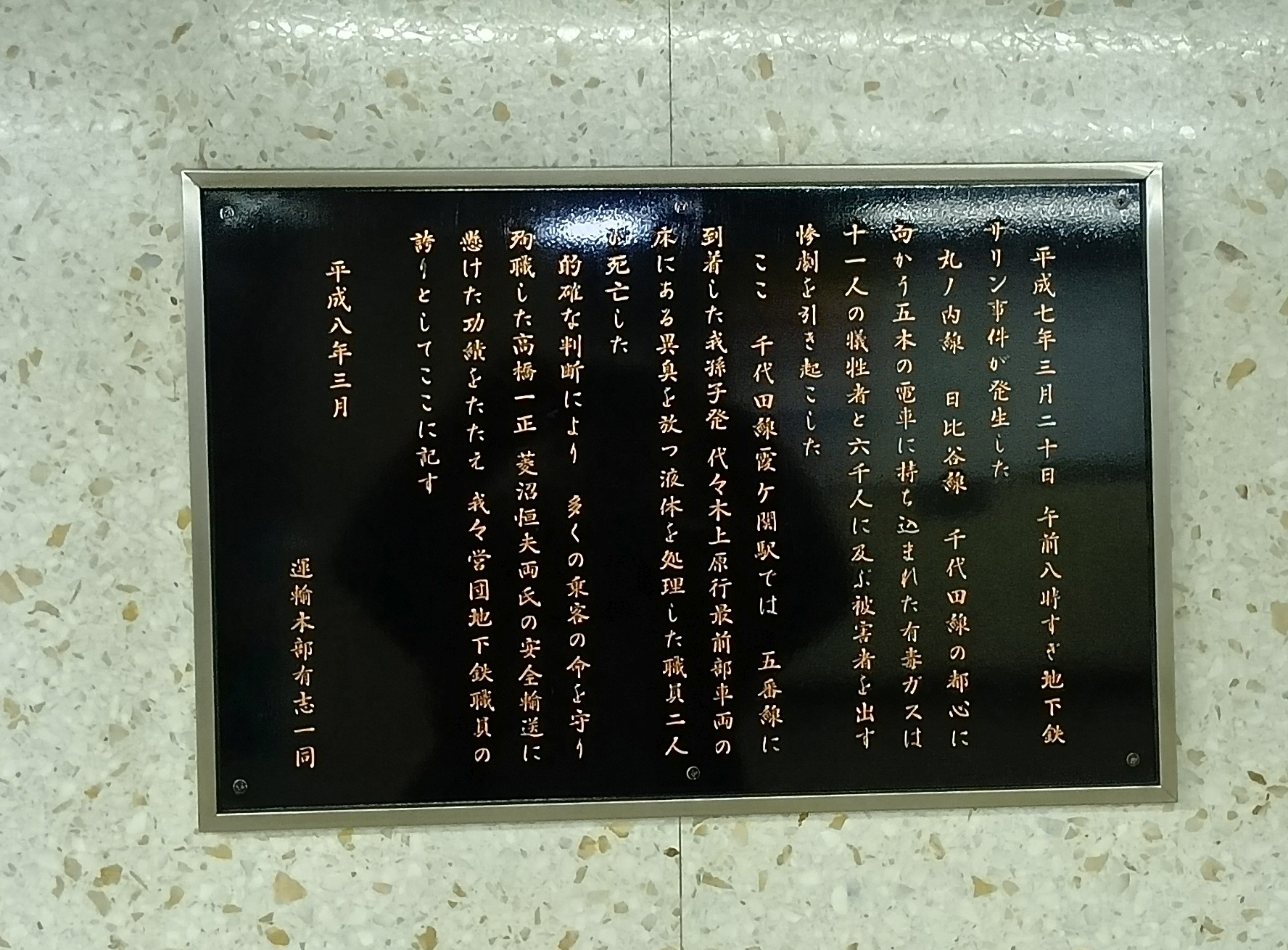 霞が関駅に戻る。駅員二人がいない。慰霊に来た関係者対応だろうか。あいかわらず、みんな素通りしている。