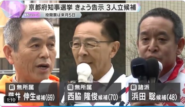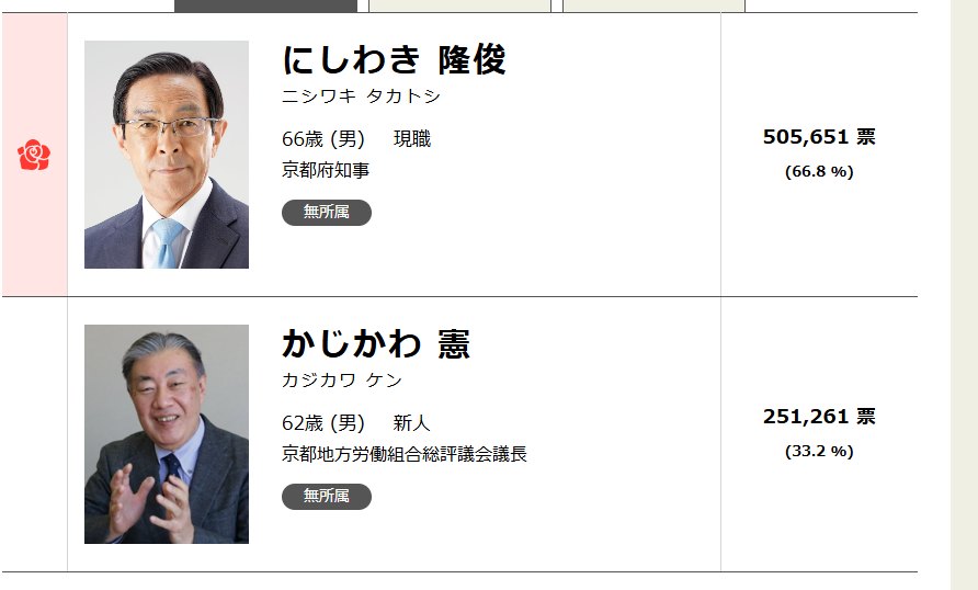 そうであれば、腐ってもかつての共産党王国・京都でもカッコいいところを見せてくれるだろう。4月5日投開票の京都府知事選。前回の京都府知事選はだいたい50万vs25万票。これがどう変化するか。