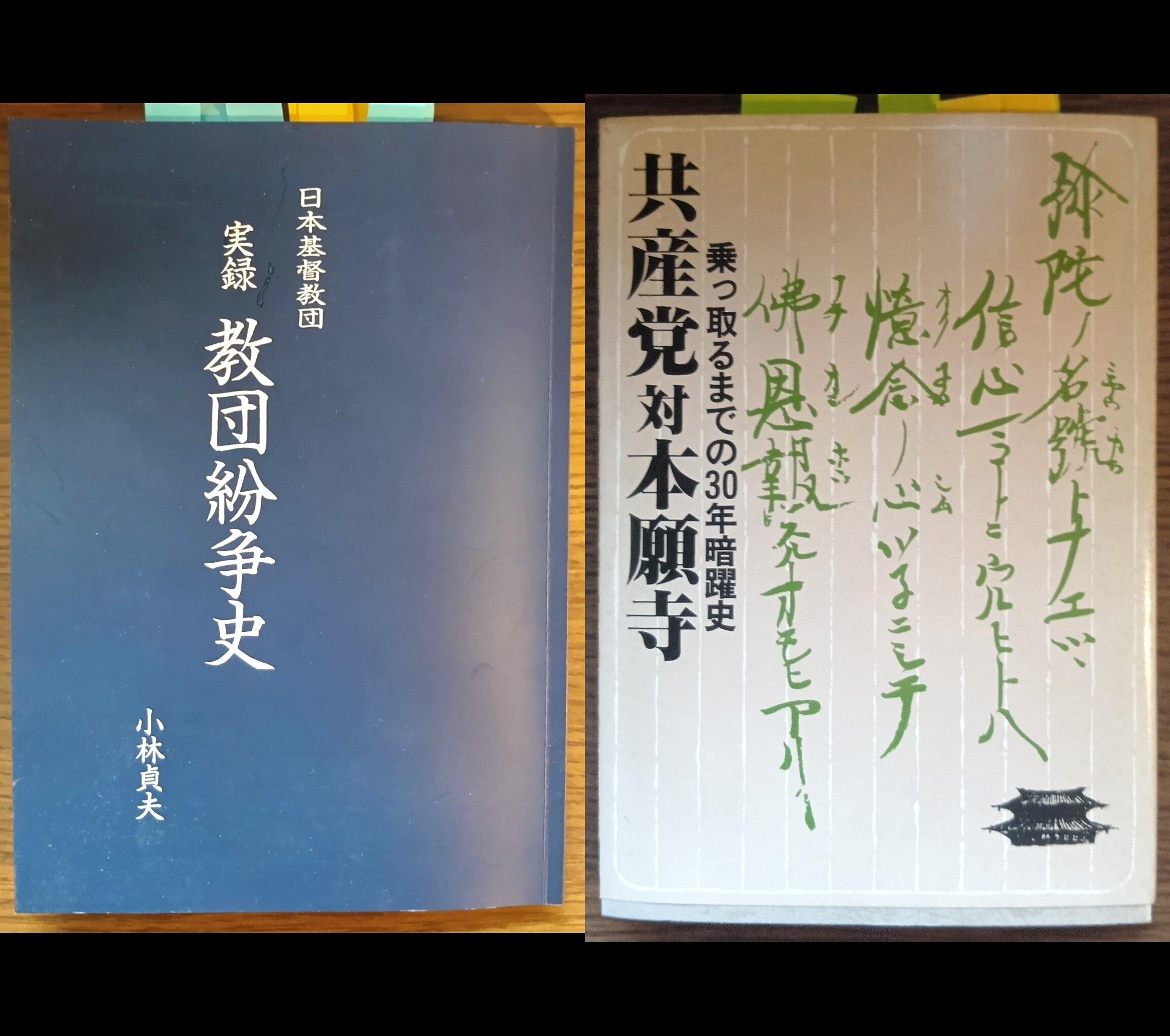 「実録教団紛争史: 日本基督教団(小林貞夫著」と「共産党対本願寺 : 乗っ取るまでの30年暗躍史(共産党から宗教を守る会)」の2冊である。