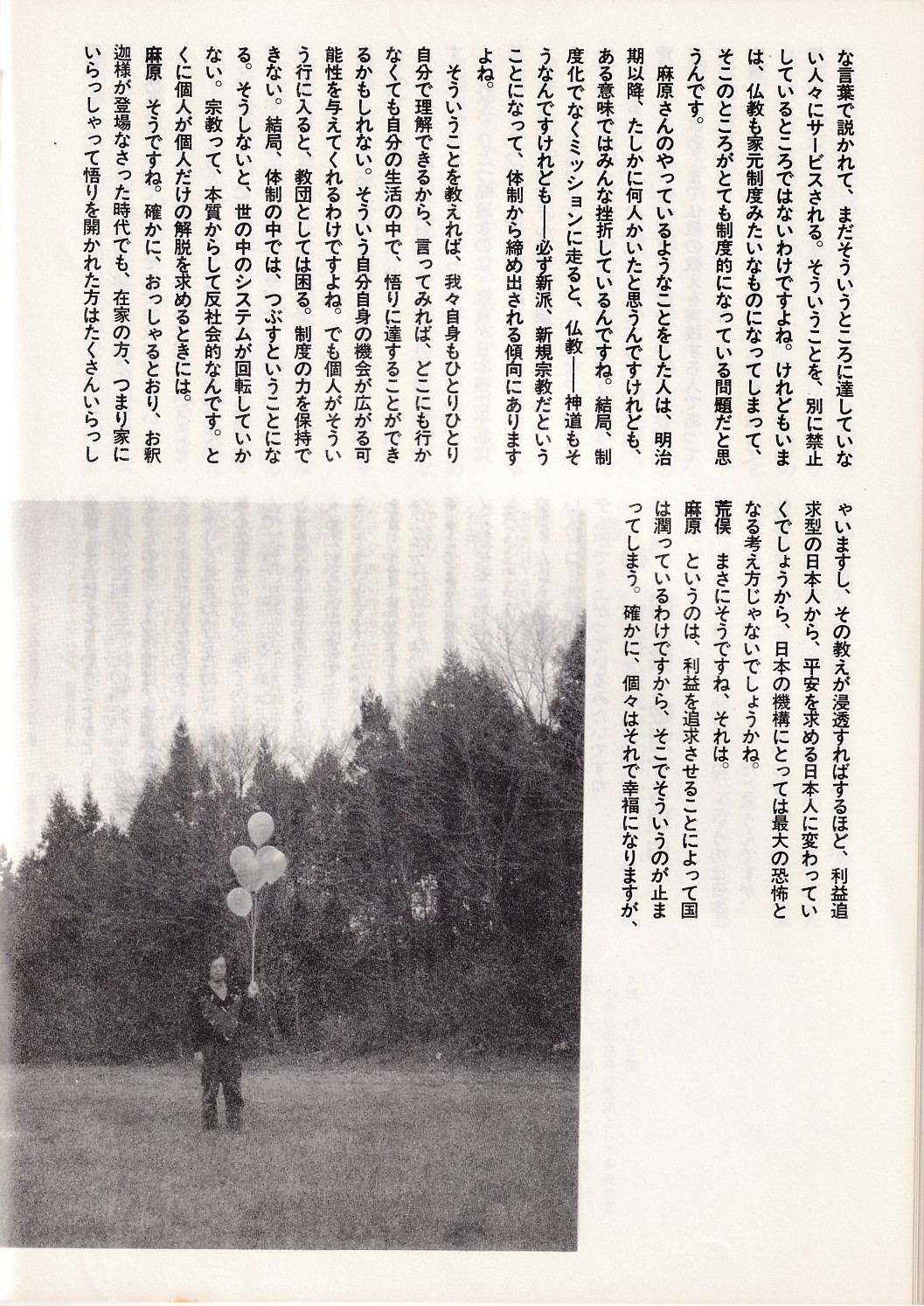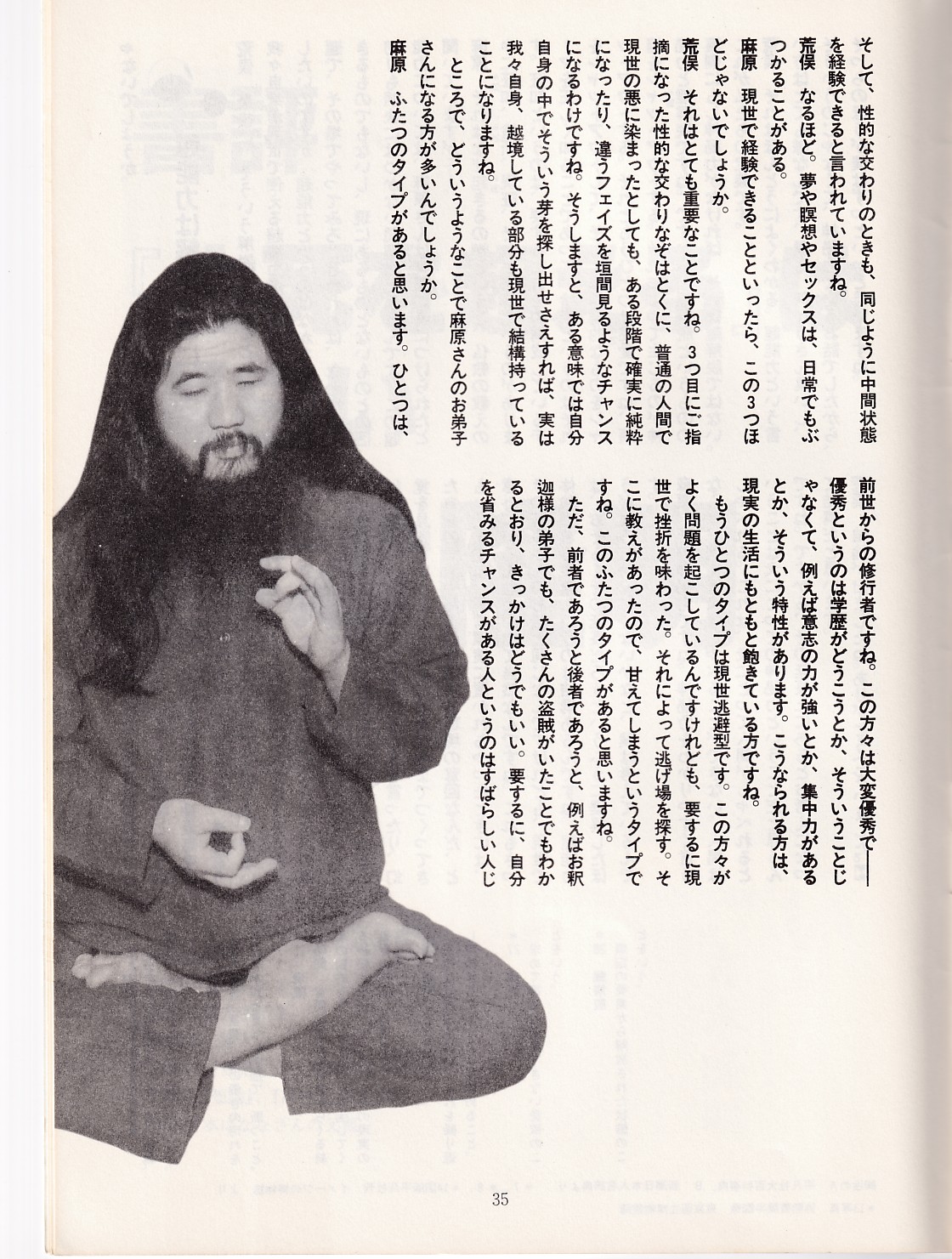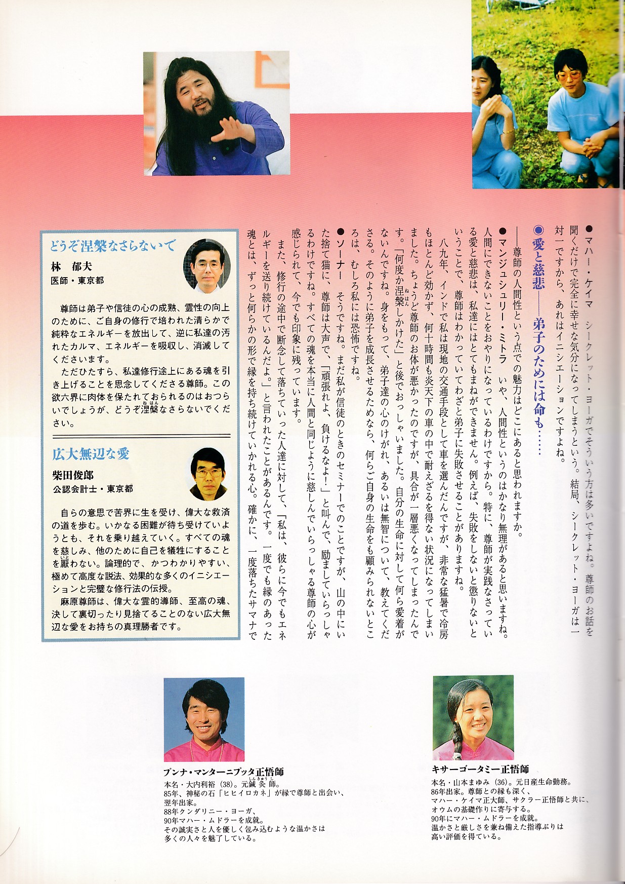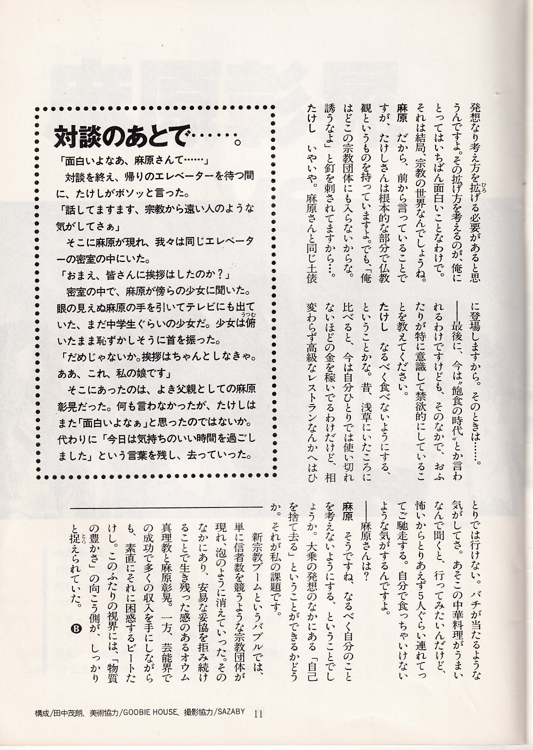 麻原尊師とビートたけしの対談。他に中沢新一・荒俣宏との対談、「生死を超える」を絶賛した吉本隆明の書評など。