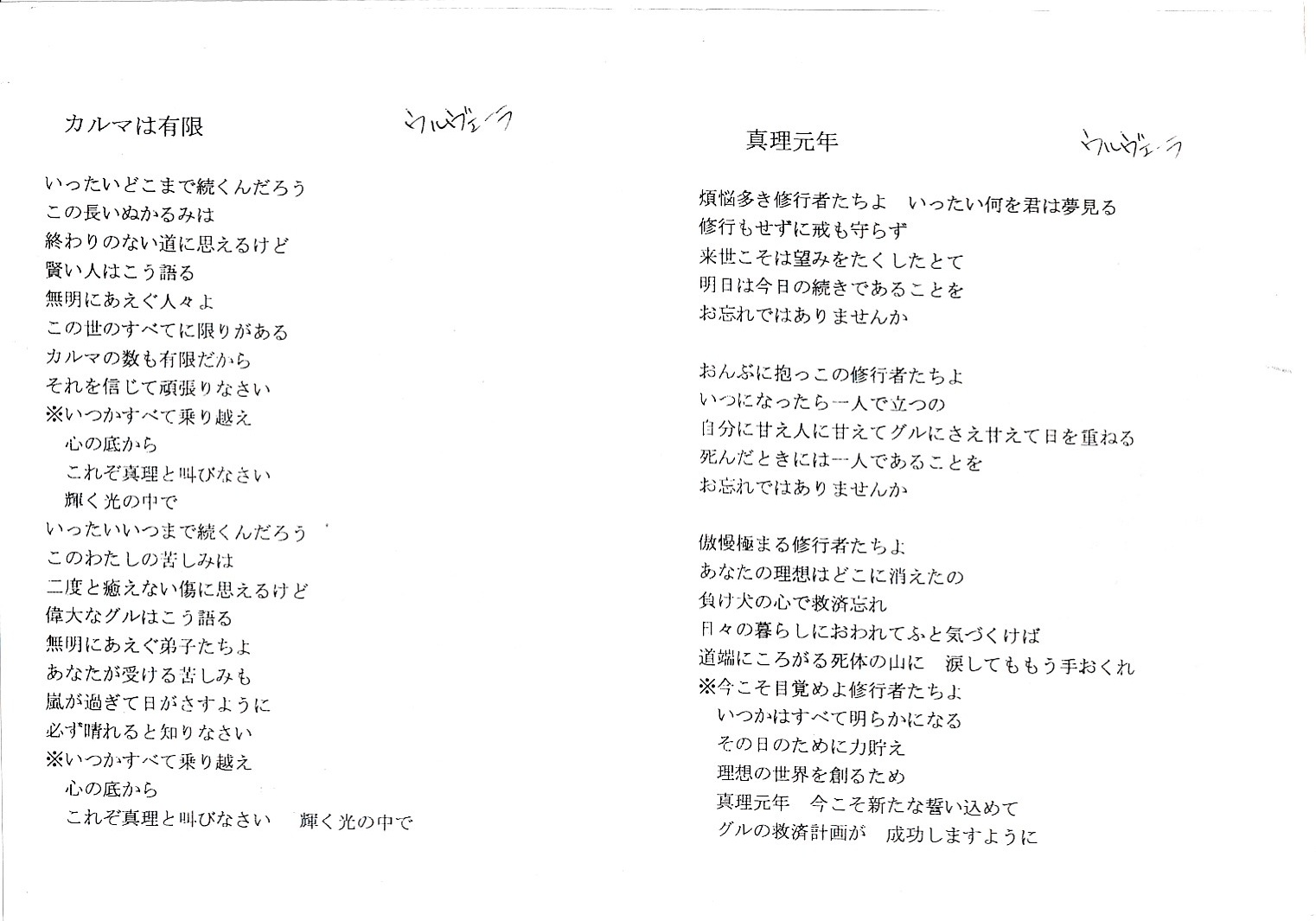 オウム真理教の歌詞カードのコーナーを作りました。