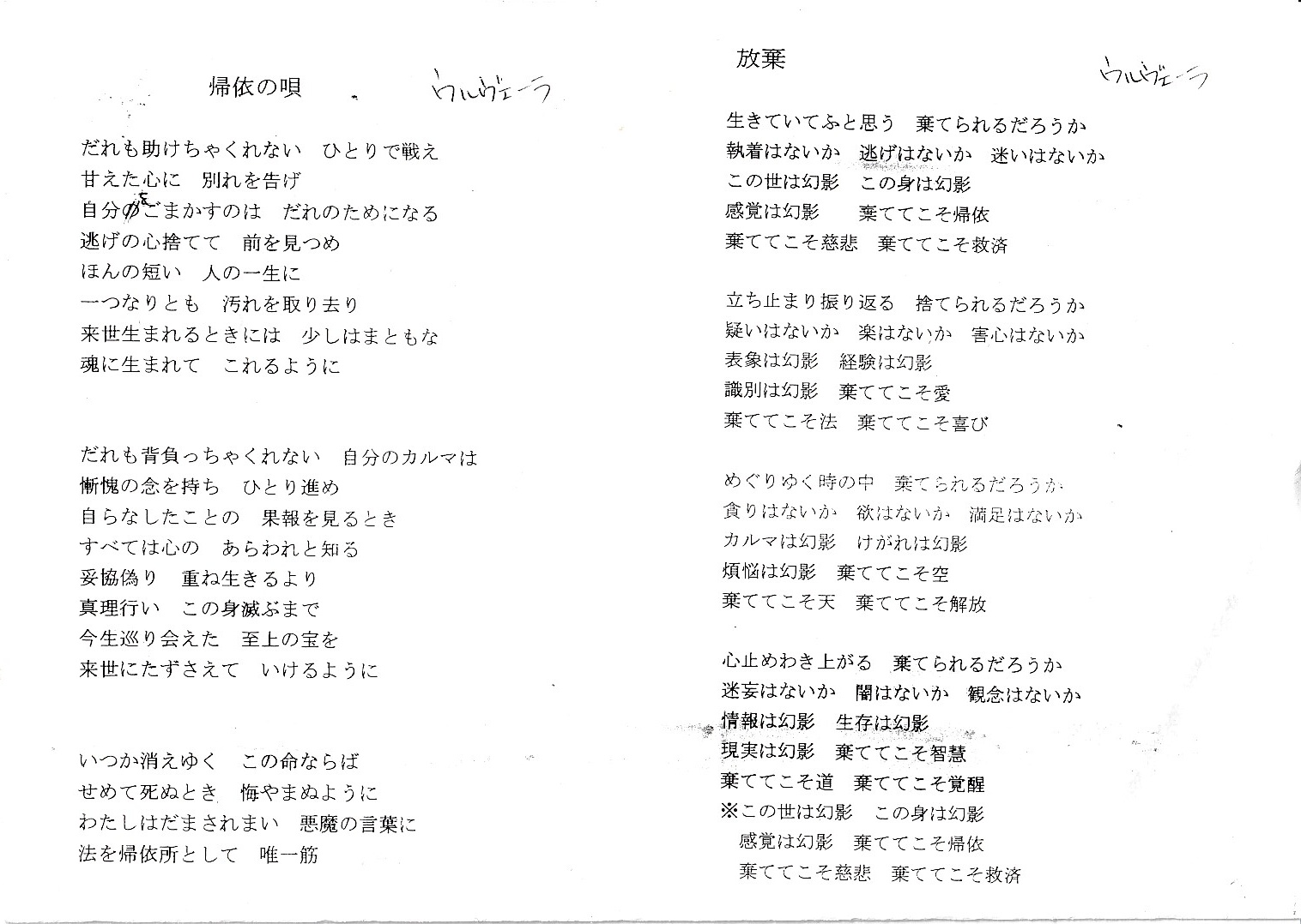 | 天へ帰れ | 覚者の数え歌 | 輪廻を超える | 五戒の詩 | マハーヤーナ |