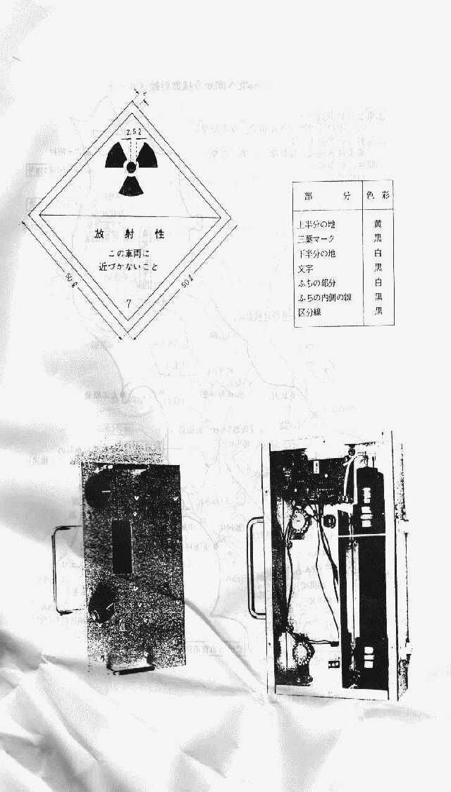 核燃料物質輸送車両には横と後部に標識を付けることが義務づけられています。標識は1辺が25cmのひし形で、上半分が黄色地で黒い三つ葉マーク、下半分が白地に「放射性 この車両に近づかないこと」という文字が記されています。この標識は小さいため、かなり近づかないと読み取れません。