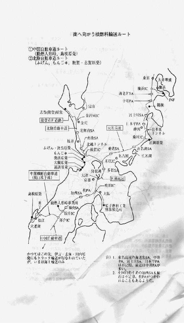 日本は狭い国土に原発や核施設が多数存在します。そのため核燃料や使用済みの核燃料が高速道や一般道を使って、ひんぱんに輸送されています。そして核燃料輸送車の荷台は、近寄れば放射線測定器の針が振り切れるほど強い放射線を出しています。したがって高速道路のパーキングエリアなどで、核燃料輸送車の隣に駐車するのを避けるのはもちろんでが、核燃料輸送車の前後左右をいっしょに走らないよう気をつけます。特に後は事故に巻き込まれる危険性が高いので絶対避けます。